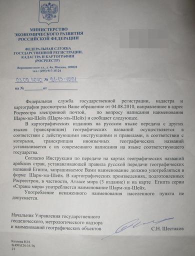 | Keywords: Sharm Russian Name.jpg en Formal response from Russian government agency on Russian spelling of Sharm el Sheikh ru Официальный ответ минэконом азвития на воп ос об именовании го ода Ша м-эш-Шейх Отскани ованное письмо РОСРЕЕСТРА п и инэконом азвития РФ инэконом азвития РФ 03 09 2010 е является объектом авто ского п ава ет Ша м-эш-Шейх Scanned Russian texts |
