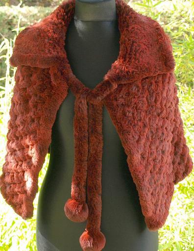 Keywords: Sheared rabbit skin, red dyed cape (1).jpg Cape aus gefärbten Kaninfellstreifen in Flechttechnik Dyed Rabbit own 2010 Libricool <span class signature-talk >talk</span> 08 28 10 October 2010 UTC <gallery>File Sheared_rabbit_skin _red_dyed_cape_ 1 jpg</gallery> Rabbit clothing Fur capes Fur fashion in 2010