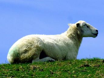 Keywords: sheep female animal mammal lying sheepskin white dormant nature out livestock grass animal world meadow creature agriculture dike quadruped sky blue rural