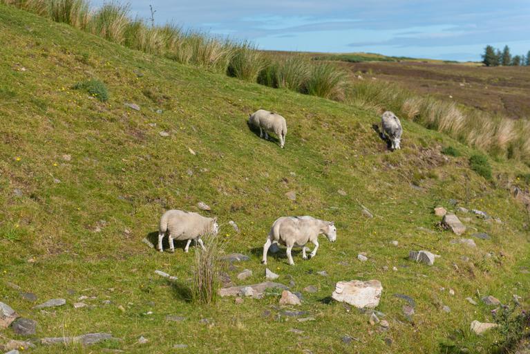 Keywords: sheep flock grass green meadow nature lamb cattle field animal farm landscape agriculture sky blue clouds fields most land wool food environment