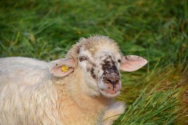 Keywords: sheep white livestock animal wool white sheep fur head close view curiosity meadow pasture lazy grass