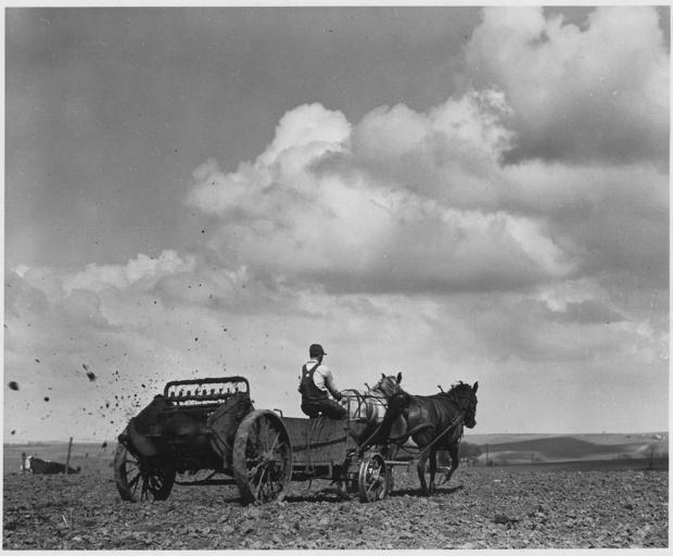 | Keywords: Shelby County, Iowa.... Detailed description, These pictures show how people in this locality preser . . . - NARA - 522378.jpg These pictures show how people in this locality preserve the fertility of their land This image shows a manure spreader being loaded and operated This last is not a usual or necessary practice and no farmer has enough barnyard manure for all his tillage This operator however puts all he has on the land and believes that it is worth his while to do so since it acts to make a good crop better General notes 522378 Local identifier 83-G-44209 Department of Agriculture Bureau of Agricultural Economics Division of Economic Information ca 1922 - ca 1953 Rusinow Irving Photographer 5307166 <br /> Still Picture Records Section Special Media Archives Services Division NWCS-S National Archives at College Park 8601 Adelphi Road College Park MD 20740-6001 1941 05 02 - _These_pictures_show_how_people_in_this_locality_preser_ _ _ _-_NARA_-_522378 jpg jpg </gallery> NARA-cooperation PD-USGov Horse-drawn wagons in the United States Manure spreaders Irving Rusinow Shelby County Iowa |