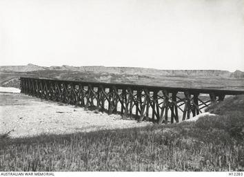Keywords: Shellal, Palestine. c. 1916. A wooden railway bridge across a river bed.jpg he גשר ×”×¢×¥ ×ž×¢× × ×—× ×”×‘×©×•×¨ 1916-06-01 AWM-image H12283 author other versions Custom license marker 2015 12 22 PD-Australia Train bridge over Habssor stream Uploaded with UploadWizard |