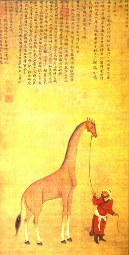 Keywords: ShenDuGiraffePainting.jpg object history exhibition history credit line 欽惟皇 陛下 嗣承太祖高皇 洪基 德化流行 協和萬邦 三光順序 百 效職 由是騶虞至 嘉禾生 甘 降 黃河清 醴泉溢 諸福之物 莫不畢至 廼永樂甲午秋 麒麟出 葛刺 表 於 臣民聚 欣慶 萬 臣聞聖人 至仁之德 乎幽明 則麒麟出 斯皆皇 陛下與天同德 恩澤廣被 草 昆蟲 飛潛動植之物 皆得生遂 故和氣融結 降生麒麟 以為 家萬萬年太平之徵 臣度 列侍從 恭覩嘉瑞 百年稽首 謹獻頌曰 於赫聖皇 廼武廼文 嗣登寶位 致治法古 萬方底定 三辰順序 兩暘時若 歲稔黍徐 民俗熙熙 無問夷阻 神百 亦得其 和氣薰蒸 溢於寰宇 乃降禎祥 澤被鱗羽 嘉禾穰穰 河清湑湑 騶虞實來 醴泉甘 諸福畢臻 維天之助 維天之助 申命春顧 惟十二年 歲 甲午 西南之陬 人海之滸 實生麒麟 形高丈五 麕身馬蹄 肉角膴膴 文采燁 玄云紫 趾不踐物 遊必擇 舒舒徐徐 動循矩度 聆其和鳴 音葉鐘呂 仁哉茲獸 曠古 遇 昭其神 登於天 群臣歡慶 爭先快 岐鳳鳴 洛 呈禹 百萬斯年 合符同矩 大瑞茲至 聖皇 御 登三邁五 天錫聖皇 水昌寶祚 臣職詞林 繆叨 著 詠詩以陳 頌歌聖主 款 儒林郎翰林院修撰 臣 沈度謹 http //www cchicc com/photo php id 98391 accession number http //painting npm gov tw/npm_public/System/View jsp ObjectID 10773 type 1 故畫002364N000000000 place of creation China http //www columbia edu/~amm2009/3956/Earlymod html <br/> direct link http //www columbia edu/~amm2009/3956/Giraffe jpeg <gallery> File Tribute Giraffe with Attendant jpg Original by Shen Du File Painting of the Giraffe from Bengal By Shen Tu copied by Ch'en T'ing-pi jpg Copy by Chen Tingbi File Chen Zhang's painting of a giraffe and its attendant jpg Copy by Chen Zhang File ShenDuGiraffePainting jpg Copy by anonymous painter from the Ming dynasty </gallery> PD-old-100 Paintings in the National Palace Museum Giraffes in art Zheng He Paintings of the Ming Dynasty |