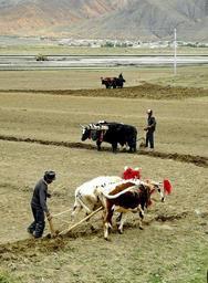 Keywords: tibet men working plow plowing ceremonial dress fields rural landscape agriculture farm