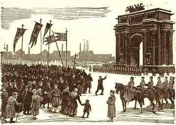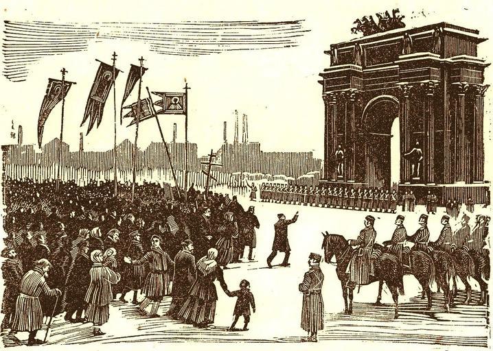 Keywords: Shestviye u Narvskikh vorot1.jpg ru Ут ом 9-го янва я у а вских во от Г авю а неизвестного художника Пе вая усская еволюция 1905 года 1925 г Author before 1925 года PD-old Bloody Sunday 1905