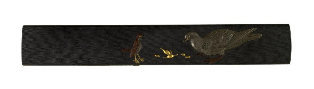 | Keywords: Shigeta Kazutsura - Kozuka with a Sparrow and a Pigeon - Walters 51638.jpg A sparrow in copper silver and gold is on the left and a pigeon in silver is on the right Between them are seeds made of gold The back of the kozuka is made of shibuichi and gold between 1794 1815 Edo shakudo shibuichi silver copper gold cm 9 6 l accession number 51 638 29681 Henry Walters Baltimore date and mode of acquisition unknown Walters Art Museum Henry Walters Acquired by Henry Walters Signature Kazutsura Sticker - edged with a blue trellis pattern 857 place of origin Kyoto Japan Walters Art Museum license Kozuka in the Walters Art Museum Shigeta Kazutsura Media contributed by the Walters Art Museum needs category review |