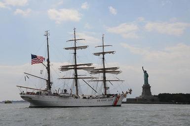 Keywords: ship cutter three masted barque full sail statue of liberty new york city water harbor coast guard training sea ocean vessel navigation deck sails eagle new york usa