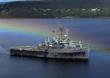 Keywords: ship military us navy bay harbor water rainbow shoreline buildings forest trees nature outside beautiful summer spring