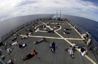 Keywords: ship sea ocean water sky clouds personnel sailors aircraft carrier stretching exercising workout military navy outside