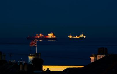 | Keywords: ship ships shipping two roof rooftops transportation boat transport cargo vessel container port industry container ship nautical harbor sea ocean shipping container commercial blue blue hour water dock industrial flag union jack peaceful night anchored island outdoor coast marina marine reflection dusk seagull bird no people |