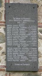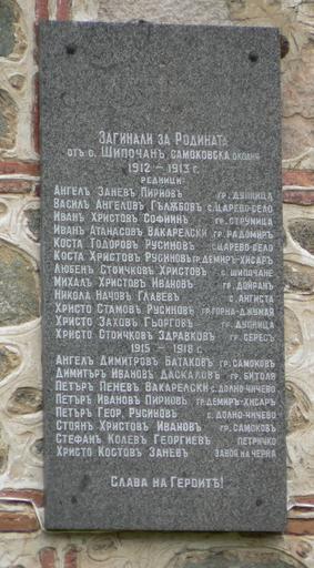 Keywords: Shipochane-war-memorial.jpg емо иална плоча на же твите от войните п ез 1912-1913 и 1915-1918 година от село Шипочане Бълга ия Поставена на стената на цъ квата Memorial plaque for the victims in wars of 1912-1913 and 1915-1918 from village Shipochane Bulgaria Placed on the church wall Own 2008-04-13 Vassia Atanassova - Spiritia Shipochane War memorials in Bulgaria Plaques in Bulgaria Monuments and memorials in Sofia Province |