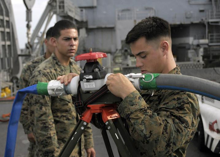 Keywords: Ships ready with Burma Aid DVIDS90545.jpg en U S Marine Lance Cpl Alex Camargo left and Lance Cpl Michael Dealba connect an intake suction hose to a Tactical Water Purifier System aboard the amphibious ship USS Harpers Ferry LSD 49 The mobile water system can produce up to 1 200 gallons of potable water under ideal conditions Harpers Ferry is part of Joint Task Force Caring Response and is standing by in international waters off the coast of Burma preparing for a humanitarian assistance operation to help victims of Cyclone Nargis 2008-05-23 Chief Petty Officer Michael Kennedy https //www dvidshub net/image/90545 080523-N-+++++-289 2008-05-24 20 59 ANDAMAN SEA PD-USGov-Military-Navy USS Harpers Ferry LSD-49 Images from DoD uploaded by Fæ |