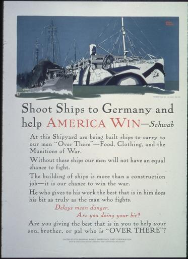 | Keywords: Shoot Ships to Germany and help America Win- Schwab, ca. 1917 - ca. 1919 - NARA - 512484.tif  Local identifier 4-P-45 U S Food Administration Educational Division Advertising Section 01/15/1918 - 01/1919 Still Picture Records Section Special Media Archives Services Division NWCS-S National Archives at College Park 8601 Adelphi Road College Park MD 20740-6001 other date circa 1917 1919 Record group Record Group 4 Records of the U S Food Administration 1917 - 1920 Record group ARC 333 World War I Posters compiled 1917 - 1919 Series ARC 512439 Variant control numbers NAIL Control Number NWDNS-4-P-45 General notes Scope and content Shoot Ships to Germany and help America Win- Schwab At this shipyard are being built ships to carry to our Over There - Food Clothing and the Munitions of War Without these ships our men will not have an equal chance to fight The building of ships is more than a construction job- it is our chance to win the war He who gives to his work the best that is in him does his bit as truly as the man who fights Delays mean danger Are you doing your bit Are you giving the best that is in you to help your son brother or pal who is Over There File unit File unit ARC yes <gallery> File Shoot_Ships_to_Germany_and_help_America_Win-_Schwab _ca _1917_-_ca _1919_-_NARA_-_512484 tif tif File Shoot_Ships_to_Germany_and_help_America_Win-_Schwab _ca _1917_-_ca _1919_-_NARA_-_512484 jpg jpg </gallery> NARA-cooperation PD-USGov Propaganda of advertising sections of the United States NARA TIF images with categorized JPGs |