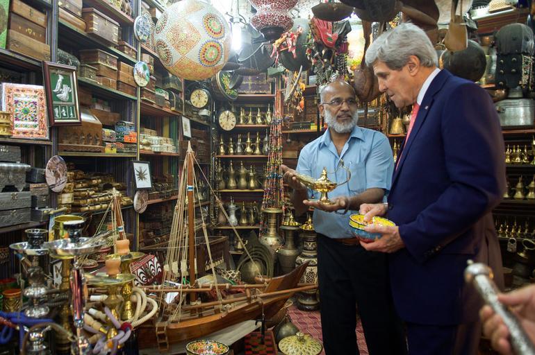 Keywords: Shopkeeper Offers Oil Lamp as Secretary Kerry Pays Visit to Muttrah Souk in Oman.jpg en A shopkeeper offers an oil lamp to U S Secretary of State John Kerry as he visits the Muttrah Souk - a traditional bazaar - in Muscat Oman on November 10 2014 during a break in P5+1 negotiations with Iran about the future of its nuclear program State Department photo/ Public Domain 2014-11-10 08 48 11 http //www flickr com/photos/9364837 N06/15759413252/ U S Department of State other versions 23 617531 58 583439 PD-USGov PD-USGov Bilateral relations of the United States Uploaded with UploadWizard Muttrah souq