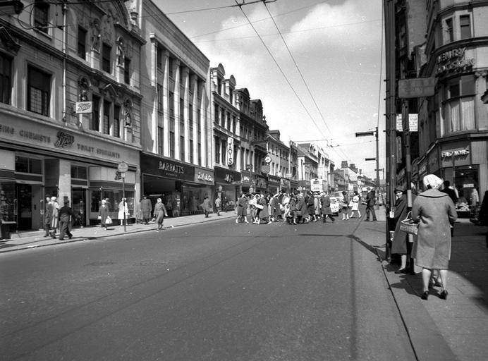 Keywords: newcastle upon tyne newcastleupontyne 1960s northumberland street northumberlandstreet shopping boots chemists bootschemists blackandwhite road monochrome architecture outdoor black and white View of Northumberland Street, Newcastle upon Tyne, May 1961 (TWAM ref. DT.TUR/26647L). You can also see an aerial view of Northumberland Street dating from 1948 here www.flickr.com/photos/twm_news/15345407391/. Tyne & Wear Archives presents a series of images taken by the Newcastle-based photographers Turners Ltd. The firm had an excellent reputation and was regularly commissioned by local businesses to take photographs of their products and their premises. Turners also sometimes took aerial and street views on their own account and many of those images have survived, giving us a fascinating glimpse of life in the North East of England in the second half of the Twentieth Century. (Copyright) We're happy for you to share these digital images within the spirit of The Commons. Please cite 'Tyne & Wear Archives & Museums' when reusing. Certain restrictions on high quality reproductions and commercial use of the original physical version apply though; if you're unsure please email archives@twmuseums.org.uk View of Northumberland Street, Newcastle upon Tyne, May 1961 (TWAM ref. DT.TUR/26647L). You can also see an aerial view of Northumberland Street dating from 1948 here www.flickr.com/photos/twm_news/15345407391/. Tyne & Wear Archives presents a series of images taken by the Newcastle-based photographers Turners Ltd. The firm had an excellent reputation and was regularly commissioned by local businesses to take photographs of their products and their premises. Turners also sometimes took aerial and street views on their own account and many of those images have survived, giving us a fascinating glimpse of life in the North East of England in the second half of the Twentieth Century. (Copyright) We're happy for you to share these digital images within the spirit of The Commons. Please cite 'Tyne & Wear Archives & Museums' when reusing. Certain restrictions on high quality reproductions and commercial use of the original physical version apply though; if you're unsure please email archives@twmuseums.org.uk |