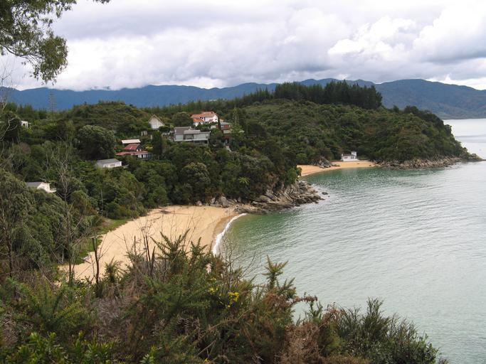 Keywords: shore coast beaches bay new zealand south island kaiteriteri coastline shoreline landscape scenic trees houses coastal tranquil private