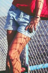 Keywords: shorts legs torso person girl female woman caucasian slim body healthy fit denim posing fence