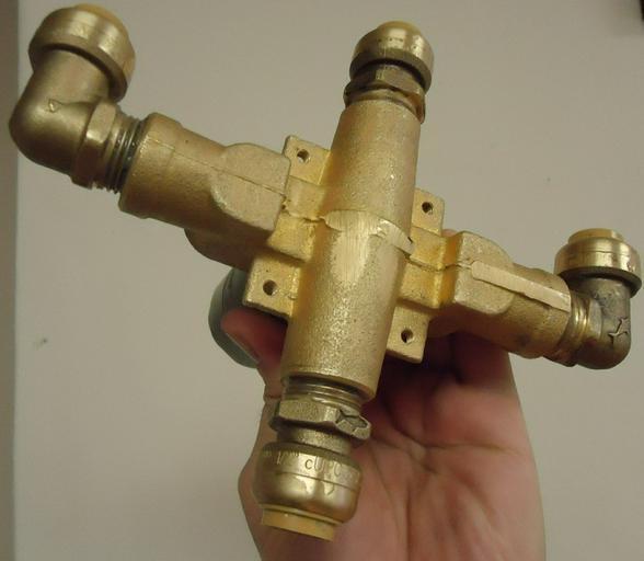 | Keywords: Shower project new diverter valve with PEX connections added.jpg en A handyman project to redo pipes behind the shower Here is the diverter valve with the PEX connections added 2012-08-16 own Tomwsulcer cc-zero Uploaded with UploadWizard Handyman photos by tom sulcer Plumbing |