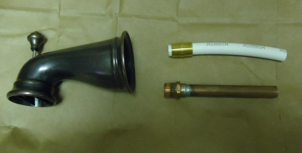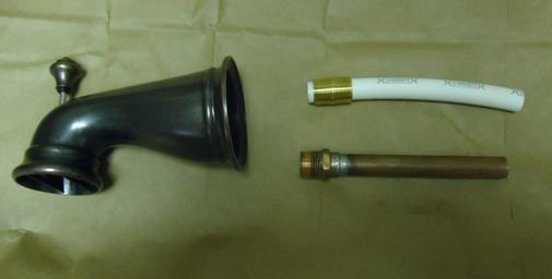 Keywords: Shower project tub spout measurements.jpg en Tub spout looks pretty right But it is badly designed The female threaded connection inside not shown is not centered As a result it is difficult to use a male threaded connector which has a hex-shaped grip the hex bumps up against the spout wall and won't turn deeply So here I use these pieces to measure the distance inside the spout so I can solder a special connector at the right length 2012-08-16 own Tomwsulcer cc-zero Uploaded with UploadWizard Handyman photos by tom sulcer Plumbing |