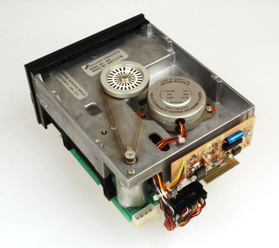 Keywords: Shugart SA 400 Minifloppy Bottom.jpg Shugart SA-400 Minifloppy was the first 5 25 inch floppy disk drive and each diskette would hold 89 600 bytes of data It was introduced by Shugart Associates of Sunnyvale California on August 27 1976 and a single drive cost 390 The 4-pin power connector and 34-pin signal interface became the industry standard for several generations of disk drives The 5 75 inch wide form factor is still a standard size for computer peripherals Width 5 75 in 146 1 mm Height 3 25 in 82 6 mm Depth 8 0 in 203 2 mm Weight 3 lbs 1 36 KG Power 12V 1 1A 5V 0 5A Photo by Michael Holley Noverber 2008 Taken with a Nikon D60 DSLR with tungsten lighting Background removed with Adobe Photoshop Elements 5 0 Own 2008-11-15 Swtpc6800 Michael Holley <gallery> File Shugart SA 400 Minifloppy Drive jpg File Shugart SA 400 Minifloppy Front jpg File Shugart SA 400 Minifloppy Rear jpg File Shugart SA 400 Minifloppy Top jpg File Shugart SA 400 Minifloppy With Disk jpg File Shugart Minifloppy Ad Sept 1977 jpg File Shugart SA 104 Minidiskette jpg File Dysan Verbatim 5 25 disks 1978 jpg File Verbatim 5 25 minidisk tracks 1978 jpg </gallery> Shugart Minifloppy Taken with Nikon D60 Photographs by User Swtpc6800 |