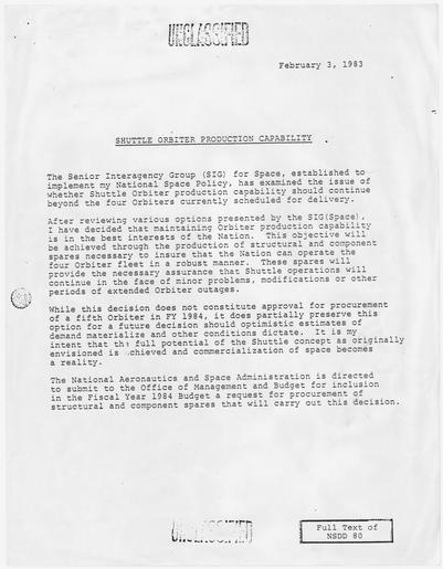 | Keywords: Shuttle Orbiter Production Capability - NARA - 198230.tif Scope and content General notes 198230 Local identifier President 1981-1989 Reagan National Security Council 1981 - 1989 Ronald Reagan Library NLRR 40 Presidential Drive Simi Valley CA 93065-0600 1983-02-03 Record group Collection RR-NSC Numbered National Security Policy Papers 1981 - 1989 Record group ARC 1189 National Security Decision Directives compiled 02/25/1981 - 01/19/1989 Series ARC 198166 File unit File unit ARC Variant control numbers NAIL Control Number NLS-NSC-NSDD-80 yes Other versions <gallery> File Shuttle_Orbiter_Production_Capability_-_NARA_-_198230 tif tif File Shuttle_Orbiter_Production_Capability_-_NARA_-_198230 jpg jpg </gallery> NARA-cooperation PD-USGov Presidential Decision Directives Reagan NARA TIF images with categorized JPGs |