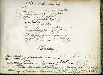Keywords: sarabråten østmarka gjestebok hyttebok signatur signaturer navnetrekk signature thomas joh. heftye thomasjohheftye thomas johannessen heftye thomasjohannessenheftye thomas j. heftye thomasjheftye thomas heftye thomasheftye heftye writing text document drawing sketch texture photo border 16. september 1865: «Jeg har paa min bag langt flere aar, End jeg paa mit hoved har haar, Idag er jeg firti og syv, men er fremdelses lige blid, Og er, hvad jeg var, i al min tid En godlidelig hjertetyv! Idag er jeg feiret ved alle maal Mad handtryk og hurra, tale og skaal, Idag er jeg konge for festen, Idag har jeg slukket min sterke tørst, Idag skal mit navn staa paa siden først, Saa kan publikum slaas om resten!» S. Rosenberg Thv. Christensen Th. Heftye Michael Müller Cappelen Helle Ingier Nils Nicolaysen Johan Andresen C. Keyser W. Rosenberg Hartvig Lassen Løvenskiold Chr. Schlytter F. Næser Fulle navn Andresen, Johan Henrik (1815 - 1874, foretningsmann. Kjøpte J. L. Tiedemans tobaksfabrik i 1849) Collett, Holger (1807 - 1870, dikter) Heftye, Jørgen Haslef (1828 - 1900, Thomas’ bror) Ihlen, Vincent (Ihen var et skogeiernavn fra Lørenskog??) Keyser, Johan Carl (1827 - 1904 - teolog og skolemann - var huslærer for Peder Anker Wedel jarlsberg)) Lassen, Hartvig Marcus (1824 - 1897, litteraturhistoriker, redaktør og lærebokforfatter) Lasson, Christian Carl Otto (1830 - 1893, far til Oda Krohg og Bokken Lasson, regjeringsadvokat og kulturinteressert) Løvenskiold, Herman Severin (gift med Thomas’ kusine Johanne "Mimsi") Muller, Michael Nicolaysen, Niels A. (1832 - ? ) Høesterettsadvokat Randers Rosenberg, Stener (1818 - ?) grosserer, "hedersgjest")) Schlytter, Chr. Fredrik Næser (gift med Thomas’ søster) W. Rosenberg Se bilde i album nr 3; www.flickr.com/photos/133429043@N02/21178842241/in/album-... 16. september 1865: «Jeg har paa min bag langt flere aar, End jeg paa mit hoved har haar, Idag er jeg firti og syv, men er fremdelses lige blid, Og er, hvad jeg var, i al min tid En godlidelig hjertetyv! Idag er jeg feiret ved alle maal Mad handtryk og hurra, tale og skaal, Idag er jeg konge for festen, Idag har jeg slukket min sterke tørst, Idag skal mit navn staa paa siden først, Saa kan publikum slaas om resten!» S. Rosenberg Thv. Christensen Th. Heftye Michael Müller Cappelen Helle Ingier Nils Nicolaysen Johan Andresen C. Keyser W. Rosenberg Hartvig Lassen Løvenskiold Chr. Schlytter F. Næser Fulle navn Andresen, Johan Henrik (1815 - 1874, foretningsmann. Kjøpte J. L. Tiedemans tobaksfabrik i 1849) Collett, Holger (1807 - 1870, dikter) Heftye, Jørgen Haslef (1828 - 1900, Thomas’ bror) Ihlen, Vincent (Ihen var et skogeiernavn fra Lørenskog??) Keyser, Johan Carl (1827 - 1904 - teolog og skolemann - var huslærer for Peder Anker Wedel jarlsberg)) Lassen, Hartvig Marcus (1824 - 1897, litteraturhistoriker, redaktør og lærebokforfatter) Lasson, Christian Carl Otto (1830 - 1893, far til Oda Krohg og Bokken Lasson, regjeringsadvokat og kulturinteressert) Løvenskiold, Herman Severin (gift med Thomas’ kusine Johanne "Mimsi") Muller, Michael Nicolaysen, Niels A. (1832 - ? ) Høesterettsadvokat Randers Rosenberg, Stener (1818 - ?) grosserer, "hedersgjest")) Schlytter, Chr. Fredrik Næser (gift med Thomas’ søster) W. Rosenberg Se bilde i album nr 3; www.flickr.com/photos/133429043@N02/21178842241/in/album-... |