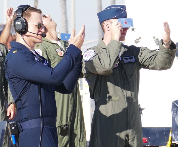 Keywords: usaf usaf thunderbirds usafthunderbirds thunderbird 9 thunderbird9 outdoor Here the current and future USAF Thunderbird 9's perform the first two steps in using a military signal mirror. At left, Maj. (Dr.) Christopher Scheibler, Thunderbird 9 for 2015-2016, performs step 1: "Reflect sunlight from the mirror onto a nearby surface, raft, hand, etc." At right, Capt. (Dr.) William "Glen" Goncharow, Thunderbird 9 for 2017-2018, performs step 2: "Slowly bring mirror up to eye level and look through sighting hold. You will see a bright light spot. This is the aim indicator". Maj. Scheibler is using a USAF issue 2"x3" glass MIL-M-18371E signal mirror. Capt. Concharow is using a 2.75"x4.25" polycarbonate "Hot Shot" signal mirror made by ACR. During airshows, traditionally Thunderbird 9 marks show center for Thunderbird 1 with a flash of sunlight from their signal mirror. Photo taken at Huntington Beach, CA, at the 10/21/2016 rehearsal session for the Breitling Huntington Beach Airshow. Here the current and future USAF Thunderbird 9's perform the first two steps in using a military signal mirror. At left, Maj. (Dr.) Christopher Scheibler, Thunderbird 9 for 2015-2016, performs step 1: "Reflect sunlight from the mirror onto a nearby surface, raft, hand, etc." At right, Capt. (Dr.) William "Glen" Goncharow, Thunderbird 9 for 2017-2018, performs step 2: "Slowly bring mirror up to eye level and look through sighting hold. You will see a bright light spot. This is the aim indicator". Maj. Scheibler is using a USAF issue 2"x3" glass MIL-M-18371E signal mirror. Capt. Concharow is using a 2.75"x4.25" polycarbonate "Hot Shot" signal mirror made by ACR. During airshows, traditionally Thunderbird 9 marks show center for Thunderbird 1 with a flash of sunlight from their signal mirror. Photo taken at Huntington Beach, CA, at the 10/21/2016 rehearsal session for the Breitling Huntington Beach Airshow. |