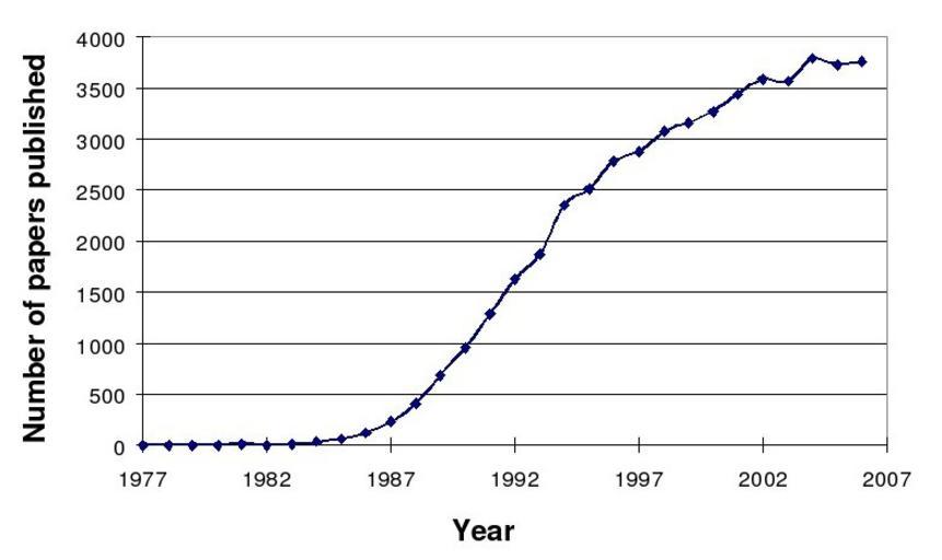| Keywords: Signal transduction publications graph.jpeg Occurrence of the term signal transduction The total number of papers published per year since 1977 containing the phrase signal transduction in their title or abstract These figures were extracted through an analysis of papers in the MEDLINE database The total published since 1st Jan 1977 through 31st December 2007 is 48 377 of which 11 211 are reviews en wikipedia 2007-03-24 K murphy wikipedia en graph K murphy Original upload log en wikipedia Signal_transduction_publications_graph jpeg wikitable - 2007-03-24 16 38 782×465× 31697 bytes K murphy <nowiki>Occurrence of the term signal transduction The total number of papers published in each year since 1977 containing the specific phrase signal transduction in either their title or abstract section are plotted These figures were extracted th</nowiki> Signal transduction |