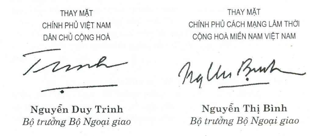 Keywords: Signes of DuyTrinh and NTBinh.jpg vi Chữ ký của Bộ trưởng ngoại giao Việt Nam Dân chủ Cộng hòa Nguyễn Duy Trinh và Bộ trưởng ngoại giao Chính phủ Cách mạng lâm th i Cộng hòa miền Nam Việt Nam Nguyễn Thị Bình tại Hiệp định Paris 1973 về Việt Nam Paris Peace Accords 1973 Nguyen Duy Trinh and Nguyen Thi Binh 1973-01-27 PD-USGov PD-USGov Vietnam War Draft |