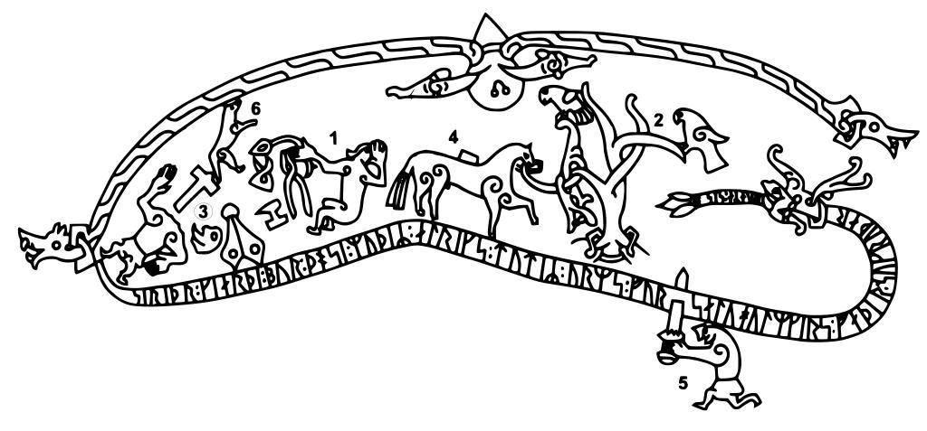 | Keywords: Sigurd.svg The 11th century Ramsund carving in Sweden depicts how Sigurd learnt the language of birds in the Poetic Edda and the Völsunga saga The Ramsund carving in Sweden depicts how Sigurd is sitting naked in front of the fire preparing the dragon heart from Fafnir for his foster-father Regin who is Fafnir's brother The heart is not finished yet and when Sigurd touches it he burns himself and sticks his finger into his mouth As he has tasted dragon blood he starts to understand the birds' song The birds say that Regin will not keep his promise of reconciliation and will try to kill Sigurd which causes Sigurd to cut off Regin's head Regin is dead beside his own head his smithing tools with which he reforged Sigurd's sword Gram are scattered around him and Regin's horse is laden will the dragon's treasure is the previous event when Sigurd killed Fafnir and shows Otr from the saga's beginning Zeichnung des Runenstein Pierre runique de Ramsund Södermanland XIe siècle Elle représente le mythe de Sigurd Sigurdr se brûle en cuisant le cœur de Fáfnir Il lèche son doigt goûtant ainsi le sang du dragon Les oiseaux révèlent à Sigurdr les mauvaises intentions de Reginn Regin mort la tête tranchée par Sigurdr Grani le cheval de Regin attaché à un arbre Sigurdr tuant Fáfnir avec son épée Gramr La loutre Ótr à l'origine de la malédiction Kamień z Ramsund w Szwecji przedstawia Sigurda nagiego przy ognisku jak przygotowuje smocze serce wyjęte Fafnirowi jako danie dla swojego ojczyma Regina będącego jednocześnie bratem Fafnira Serce nie jest jeszcze gotowe gdy Sigurd dotyka go parzy się i wkłada palce do ust Po skosztowaniu krwi smoka zaczyna rozumieć mowę ptaków Ptaki mówią mu że Regin nie dotrzyma obietnicy pogodzenia się i będzie próbował zabić Sigurda co doprowadza do tego że Sigurd odcina Reginowi głowę Regin leży martwy z głową u boku i swoimi narzędziami kowalskimi jakich użył do przekucia miecza Sigurda Grama zaś koń Regina jest objuczony skarbami smoka Wcześniejsze wydarzenie - zabicie Fafnira przez Sigurda Karzeł od którego zaczęła się cała saga ラムスンド彫刻画に描かれている ヴォルスンガ・サガの La scultura di Rasmund del XI secolo in Svezia mostra come Sigfrido impari il linguaggio degli uccelli nell'Edda poetica e nella Saga di Volsung L'incisione di Ramsund che ritrae brani della Saga Völsunga Sigfrido uccide il drago Sigfrido è seduto nudo davanti al fuoco e preparando il cuore di drago di Fáfnir per il suo padre adottivo Reginn fratello di Fáfnir Il cuore non è ancora pronto e quando Sigfrido lo tocca si brucia e si porta il dito alla bocca Nel momento in cui assapora il sangue di drago inizia a capire il canto degli uccelli Gli uccelli dicono che Reginn non manterrà la sua promessa di riconciliazione e cercherà di uccidere Sigfrido e ciò porta l'eroe a uccidere Reginn tagliandogli la testa Reginn è morto e giace vicino alla propria testa con gli strumenti coi quali ha riforgiato la spada di Sigfrido Gramr sparsi intorno a lui e il cavallo di Regin viene caricato del tesoro del drago Qui viene mostrato l'evento precedente l'uccisione di Fáfnir da parte di Sigfrido Infine viene mostrato Ótr all'inizio della saga O Ramsund descreve trechos da Saga de Völsunga O Ramsund descreve trechos da Saga de Völsunga La piedra tallada de Ramsund del siglo XI Suecia representa cómo Sigurd aprendió el lenguaje de los pájaros en la Edda poética y la Saga Völsunga Sigurd está sentado desnudo frente al fuego preparando el corazón del dragón Fafnir para su padre adoptivo Regin hermano de Fafnir El corazón aún no está listo y cuando Sigurd lo toca se quema y se pone el dedo en la boca Cuando prueba la sangre del dragón empieza a entender el canto de los pájaros Los pájaros dicen que Regin no mantendrá su promesa de reconciliación e intentará asesinar a Sigurd lo que provoca que Sigurd corte la cabeza de Regin Regin yace muerto al lado de su cabeza sus herramientas de herrero con las que volvió a forjar Gram la espada de Sigurd están esparcidas a su alrededor El caballo de Regin está cargado con el tesoro del dragón Es el suceso anterior donde Sigurd mata a Fafnir y muestra a Ótr en el inicio de la saga Ramsundsristningen Sigurdsristningen vid Ramsund Sundbyholm Sörmlands runinskrifter 101 Ramsundsristningen Södermanlands runinskrifter 101 Ramsundsristningen Ramsundin kaiverrus kuvaa kuinka Sigurd tappaa Fafnirin ja Reginin Vanemas Eddas jutustatud Sigurd Faafniritapja lugu kujutatuna Ramsundi ruunikivil Rootsis 10033800390001 Jäder 39 1 From the Nordisk familjebok Original jpeg uploaded to Commons from the Swedish Wikipedia by Gizmo II Converted to png and edited by Liquid 2003 Png version vectorised by Editor at Large PD-Ugglan Creatures in Norse mythology Nibelungs Jötnar Ramsund Sigurd inscription Völsunga saga Farandole |