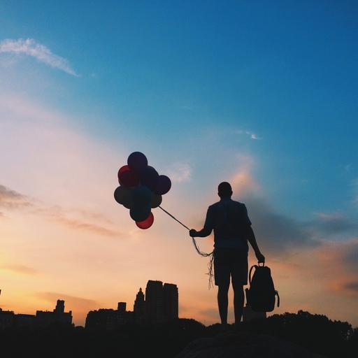 Keywords: silhouette balloons sunrise person sky colorful sunset dusk shadow backpack man guy clouds skyline