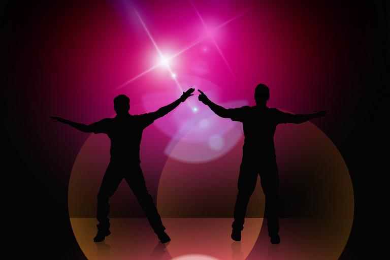 Keywords: silhouette men gay love relationship joy fun movement jump light laser light show colorful light beam color rays darkness lighting party music light effects ray optics evening artificial light dance disco nightclub celebrate dancers human lust for life joy of life blue club night club dance bar dance club mood dance floor