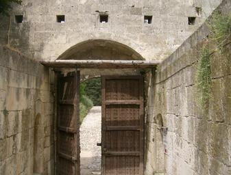 Keywords: Silistra fort 2.jpg bg а излизане от табията de Rückseite des Tores Man sieht die umgeschlagenen Nägel die äußern Blechplatten festhalten Darüber Schießscharten der Festungsmauer own Izvora 2010-06-19 Medzhidi Tabia City gates in Bulgaria