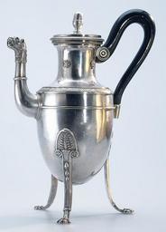 | Keywords: Silver. Kaffekanna- Coffee pot - Hallwylska museet - 5087.tif Invändigt förgylld Äggformad med upptill indraget liv på tre ben med tassfötter och palmettbeslag bladbård fyra pålagda rosetter och pärlstav; lock med godronnering och ollonformad knopp samt pip avslutad av ett hundhuvud Skaft av svärtad björk - - Gilt interior Oviform body incurved at the top on three legs with paw feet and palmette mounts foliated border four applied rosettes with beading gadrooned lid with acorn-shaped finial spout with a dogs terminal Handle of black -stained birch <br/><br/>Gåva till Wilhelmina von Hallwyl julaftonen 1899 från hennes dotter Ebba von Eckermann och kammarherren Wilhelm von Eckermann original caption Silver Kaffekanna/ Coffee pot XLII I F a 04 1823 size cm 21 8 HWY place of origin Stockholm SE original filename hm_t09247 16424 inventory number HWY XLII I F a 04 5087 CC-BY-SA <gallery caption Different images of same object > File Silver Kaffekanna- Coffee pot - Hallwylska museet - 82133 tif </gallery> Silver in the Hallwyl museum Media contributed by LSH unmatched creator Media contributed by LSH 2013-10 |
