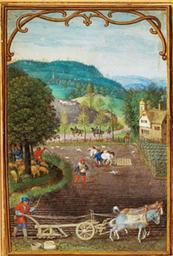 Keywords: Simonbening.jpg This is a double-sided leaf illustrating typical occupations for August/September and September /October It is probably from a series of the Twelve Months The side reproduced here features an exquisitely detailed scene showing peasants sowing and ploughing It represents September or October Miniatures were first painted to decorate and illustrate hand-written books From the 1460s onwards there was competition from printed books However wealthy patrons continued to provide a market for beautifully produced books or independent miniatures including scenes like those painted by Simon Bening Watercolour vellum cm 9 5 14 no E 4576-1910 Victoria and Albert Museum http //www vam ac uk/content/articles/t/origin-of-portrait-miniature/ 1540 Creator Simon Bening PD-art-100 Simon Bening Medieval objects in the Victoria Albert Museum Paintings of autumn 1540s paintings in the United Kingdom 16th-century watercolor paintings 16th-century illuminated manuscripts Books of Hours Peasants in the 16th century Farming in medieval miniature |