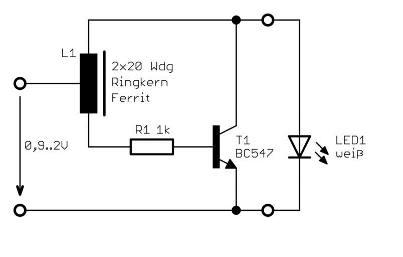 Keywords: Simple LED-Boost-Converter.svg en Simple LED boost converter circuit LED threshold voltage is used as regulating element Coil has to be 20 50 windings on a ferrite ring with tap in center Parts are not critical any NPN transistor/coil wire/ring diameter and ferrite material will do de Einfacher Aufwärtswandler für LEDs own Janka Cc-zero Electronic_diagrams Light-emitting diode circuits