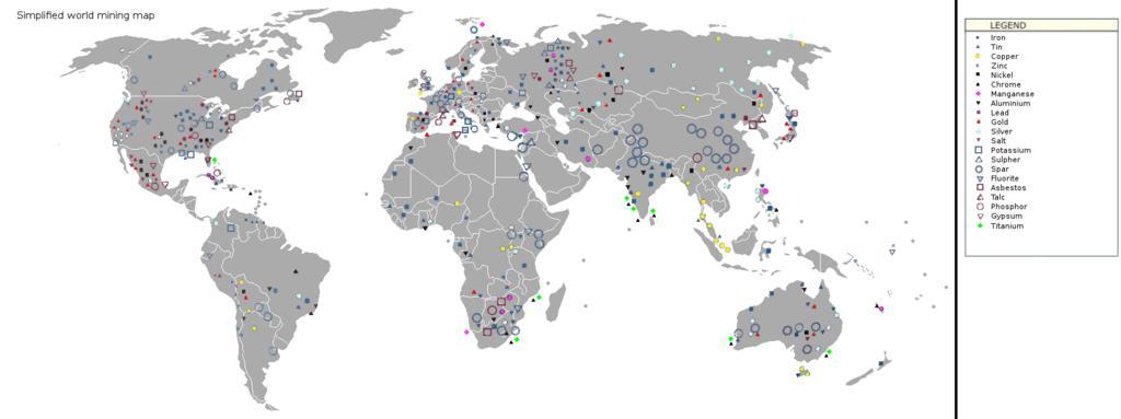 | Keywords: Simplified world mining map 1.png en A schematic showing the locations of certain ores in the world A specific focus has been put on metals and construction materials Natural resources that are used for energy fossil oil gas can be found on another map Aldough metals can still be won from regular mining most metals can now be much more economically won from landfills This as landfills require much less labour less soil needs to be dug off and sieved In addition the use of a cradle-to-cradle material recovery can also save allot of labour and is therefore also more economically attractive For some materials however regular mining will still need to continue In this case it is best to choose ore sites that are located in biodiversity-poor regions eg mountainous regions regions outside of the tropical-subtropical zone As the map is simplified we can herefore study the maps from the USGS at http //mrdata usgs gov/ ; the database is also usable with Google Earth see http //www gelib com/world-mineral-resources htm Finally note that on the map the markers may vary in size however this doesn't relate to the size of the mineral/materials stores this is simply an incorrection due to the resizing The map was made using data from the book Future Energy and Resources by Robin Kerrod and Working with the oceans by Lawrence Williams and Alan Collinson own KVDP 2009-01-18 Mining maps Natural resources |