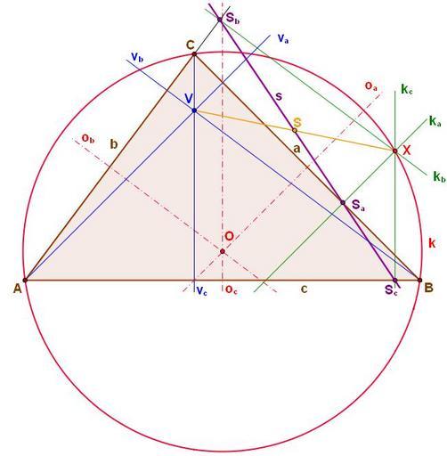 Keywords: Simson line.JPG en The circumcircle and the Simson line ΔABC a b c sides o<sub>a</sub> o<sub>b</sub> o<sub>c</sub> perpendicular bisectors O intersection of the perpendicular bisectors circumcenter X random circumcircle point k<sub>a</sub> k<sub>b</sub> k<sub>c</sub> perpendiculars to sides including the X point S<sub>a</sub> S<sub>b</sub> S<sub>c</sub> intersections of sides and k<sub>a</sub> k<sub>b</sub> k<sub>c</sub> perpendiculars s Simson line v<sub>a</sub> v<sub>b</sub> v<sub>c</sub> altitudes V orthocenter S center of the VX line segment cs Kružnice opsaná a Simsonova přímka ΔABC a b c strany o<sub>a</sub> o<sub>b</sub> o<sub>c</sub> - osy stran O průsečík os stran střed kružnice opsané X libovolný bod ležící na kružnici opsané k<sub>a</sub> k<sub>b</sub> k<sub>c</sub> kolmice na strany spuštěné z bodu X S<sub>a</sub> S<sub>b</sub> S<sub>c</sub> paty kolmic k<sub>a</sub> k<sub>b</sub> k<sub>c</sub> s Simsonova přímka v<sub>a</sub> v<sub>b</sub> v<sub>c</sub> výšky V průsečík výšek ortocentrum S střed úsečky VX own Lukas Sova 01/042009 SVG Simson line Triangle's circles Circumcircles of triangles