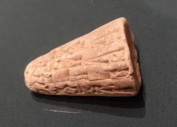 Keywords: Sin-kashid cone (sikkatu), c. 1850 BC - Oriental Institute Museum, University of Chicago - DSC07176.JPG en Exhibit in the Oriental Institute Museum University of Chicago Chicago Illinois USA This work is old enough so that it is in the public domain Photography was permitted in the museum without restriction Translation Sin-kashid mighty man king of Uruk king of the Amnanum provider of the temple Eanna built his royal palace 2014-08-22 14 44 26 own Daderot other versions cc-zero Inscriptions in the Oriental Institute Museum Uploaded with UploadWizard Cuneiform on clay nails or cones Sîn-kāšid Uruk |