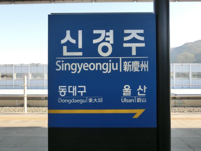 Keywords: Singyeongju Station sign.JPG Singyeongju Station sign 신경주역 역명판 新慶州駅駅名標 own 2016-02-21 Abasaa あばさー Train station signs in South Korea Multilingual signs in South Korea Singyeongju Station Korean Hanja