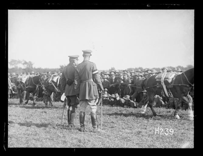 | Keywords: blackandwhite monochrome photo border outdoor black and white The Commander in Chief, Sir Douglas Haig, with General Godley in the ring at the Anzac Horse Show held during World War I. They have their backs to the camera. Photograph taken France 15 September 1917 by Henry Armytage Sanders. Inscriptions: Inscribed - Photographer's title on negative -bottom right: H239. Quantity: 1 b&w original negative(s). Physical Description: Dry plate glass negative 3.25 x 4.25 inches Sir Douglas Haig and General Godley at the Anzac Horse Show, World War I. Royal New Zealand Returned and Services' Association :New Zealand official negatives, World War 1914-1918. Ref: 1/4-009480-G. Alexander Turnbull Library, Wellington, New Zealand. natlib.govt.nz/records/23031037 The Commander in Chief, Sir Douglas Haig, with General Godley in the ring at the Anzac Horse Show held during World War I. They have their backs to the camera. Photograph taken France 15 September 1917 by Henry Armytage Sanders. Inscriptions: Inscribed - Photographer's title on negative -bottom right: H239. Quantity: 1 b&w original negative(s). Physical Description: Dry plate glass negative 3.25 x 4.25 inches Sir Douglas Haig and General Godley at the Anzac Horse Show, World War I. Royal New Zealand Returned and Services' Association :New Zealand official negatives, World War 1914-1918. Ref: 1/4-009480-G. Alexander Turnbull Library, Wellington, New Zealand. natlib.govt.nz/records/23031037 |
