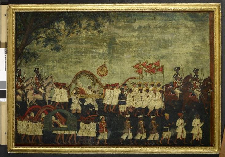 Keywords: Sir John Dalling and fellow officers in procession.jpg en Painting using black ink body colour gold paint and varnish on paper mounted on canvas of Sir John Dalling and fellow officers in procession Dalling reclines in an ornate palanquin carried by several bearers who wear white jamas short lower garments and red turbans Near the palanquin a bearer walks carrying a golden fan In front of it a group of men in jamas dhotis and yellow turbans proceed bearing fluttering flags The procession begins and ends with a squadron of the Madras Native Infantry in red coats breeches and turbans each bearing a sword In the foreground three fellow officers are carried in palanquins preceded by a number of attendants The painting is framed and glazed seemingly behind its original glass 1785-1786 http //www britishmuseum org/research/search_the_collection_database/search_object_details aspx objectid 1556601 partid 1 searchText later+mughal fromADBC ad toADBC ad numpages 10 images on orig 2fresearch 2fsearch_the_collection_database aspx currentPage 5 author PD-old-100 Uploaded with UploadWizard Nautch in art |