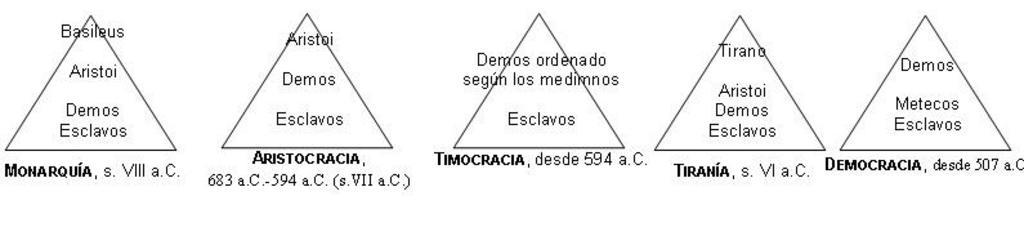 | Keywords: Sistemas políticos Grecia Antigua.JPG Grecia fue la civilización donde de manera más consciente los políticos se esforzaron por conseguir un gobierno justo y equitativo para todos los ciudadanos En concreto brilló por su genio político la polis o ciudad-Estado de Atenas En la imagen cronológicamente ordenadas la sucesión de regímenes de la ciudad-Estado de Atenas que llevaron desde una monarquía o diarquía sistema común en Oriente Próximo en el siglo VII antes de Cristo hasta la Constitución democrática de Clístenes 510-507 a C Entre Monarquía y Democracia los atenienses experimentaron la Aristocracia la Oligarquía o Timocracia de Solón y la Tiranía asociada en Atenas al nombre de Pisístrato y los Pisistrátidas Este vocabulario para designar regímenes políticos que proviene de la Antigua Civilización Griega pervive en la actualidad con casi los mismos significados 2006-12-26 own assumed Pistachoveloz derivative works Sistema politico grecia antica svg Constitutional law Democracy Cleisthenes economia |
