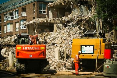 Keywords: site demolition excavators home work crash construction work building rubble debris destruction destroyed broken reinforced concrete vehicle stones construction vehicle demolition work build ruin construction tear off old building house demolition