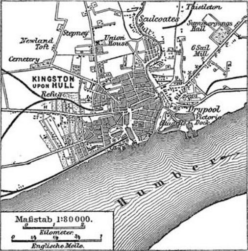 Keywords: Situationsplan von Hull.jpg Quelle Meyers Konversationslexikon von 1888 Band 8 Seite 782 PD-Meyers Old maps of Kingston upon Hull 1888