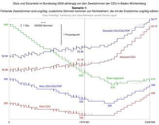 | Keywords: Sitze und Sitzanteile im Bundestag 2009 abhängig von den Zweitstimmen der CDU in Baden-Württemberg – Szenario 1.svg de Darstellung des hypothetischen Ergebnis der Bundestagswahl 2009 wenn die CDU in Baden-Württemberg weniger oder mehr Zweitstimmen bekommen hätte Szenario 1 Fehlende Zweitstimmen sind ungültig da die Erststimme unverändert bleibt ; zusätzliche Stimmen kommen von Nichtwählern die mit der Erststimme ungültig wählen oder von ungültigen Zweitstimmen die aber nur beschränkt verfügbar sind Bei einem Patt werden halbe Sitze verteilt die im Fall der Oberverteilung in der Unterverteilung an das Land mit dem höchsten unerfüllten Sitzanspruch gehen nächste Höchstzahl bei Sainte-Laguë höchster verbleibender Bruchteil bei Hare/Niemeyer Kontext Negatives Stimmengewicht own …¡ …¦ …« 2010-01-15 File Sitze und Sitzanteile im Bundestag 2009 abhängig von den Zweitstimmen der CDU in Baden-Württemberg “ Szenario 2 svg File Sitze und Sitzanteile im Bundestag 2009 abhängig von den Zweitstimmen der CDU in Baden-Württemberg “ Szenario 3 svg Voting systems Bundestag elections |