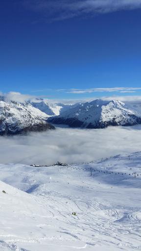 Keywords: ski area mountains fog landscape valley nature sky weather outlook alpine distant view rock paradise cloud panorama sun foresight summit blue distant sölden peaceful mood view vision overview winter horizon quiet freedom holiday idyll relaxation