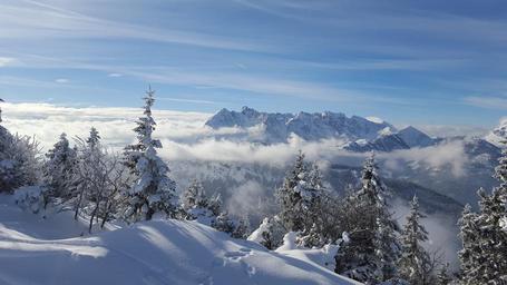 Keywords: ski skiing kössen tyrol austria wintry winter snow ski area ski poles winter sports ski run cold sport firs clouds mountains landscape snowy nature