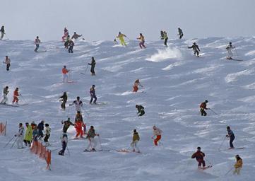 Keywords: ski slope winter peaks sunny mountainside skiers people sun tourism frozen vacation sport summit white holiday serene blue mountain sky resort snow nature landscape